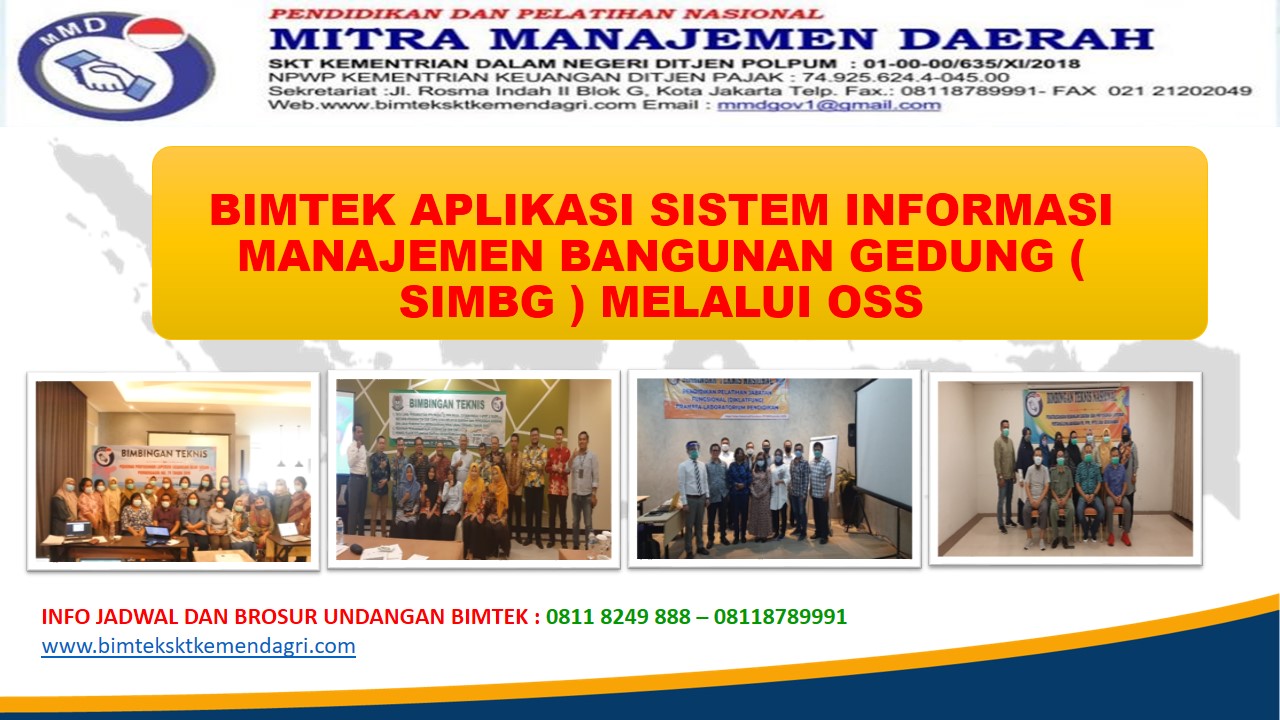 SIMBG merupakan singkatan dari Sistem Informasi Manajemen Bangunan Gedung yang disediakan oleh Kementerian Pekerjaan Umum dan Perumahan Rakyat yang dapat digunakan oleh Pemerintah Daerah dalam memberikan pelayanan terkait bangunan gedung.SIMBG sendiri merupakan aplikasi berbasis web yang terintegrasi dengan Online Single Submission (OSS) untuk perijinan khusus Izin Mendirikan Bangunan (IMB) dan Sertifikat Laik Fungsi (SLF) sehingga masyarakat dapat mengajukan permohonan secara online kapan saja dimana saja selama ada akses internet Untuk itu para pejabat Instansi Pemerintahan Daerah baik Gubernur, Bupati, Walikota, maupun lingkup Satuan Kerja Perangkat Daerah ( SKPD ) haruslah memiliki pengetahuan dan pemahaman yang optimal mengenai Opsi Di Atas untuk itu kami dari MITRA MANAJEMEN DAERAH SKT KEMENDAGRI DITJEN POLPUM : 01-00-00/635/XI/2018 mengharapkan keikutsertaan Pemerintah Daerah (Gubernur/Bupati/Walikota, Sekretariat Daerah serta SKPD terkait untuk mengikuti Bimtek Aplikasi Sistem Informasi Manajemen Bangunan Gedung ( SIMBG ) Melalui OSS